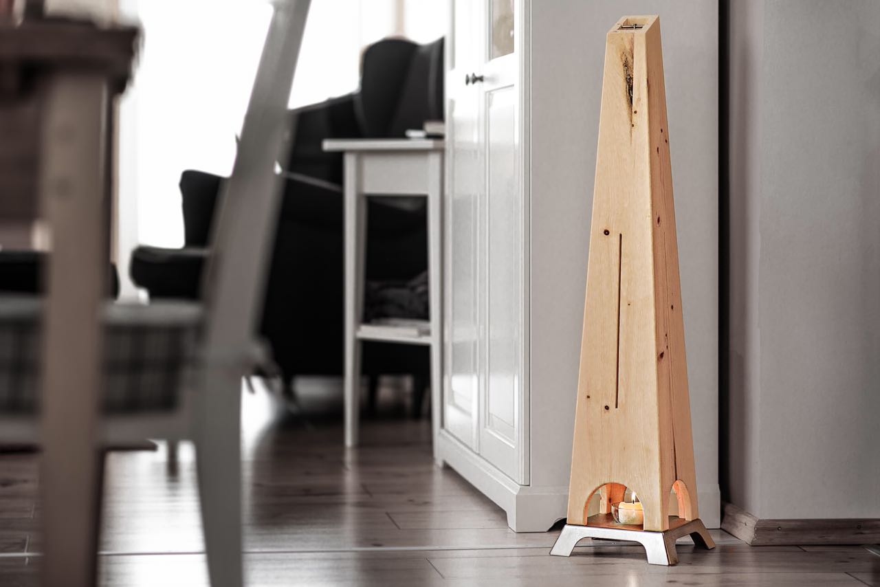 se compose d'un réservoir d'eau en acier inoxydable dans lequel sont insérés cinq bâtonnets de pin des Alpes et accrochées dans la partie haute de la cheminée du Tyrol.