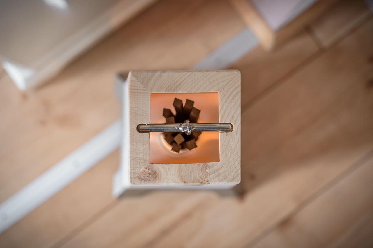 Ensuite cet air chaud se charge en huiles essentielles contenues dans le pin des Alpes. L’odeur agréable du pin des Alpes se répand rapidement dans toute la pièce.